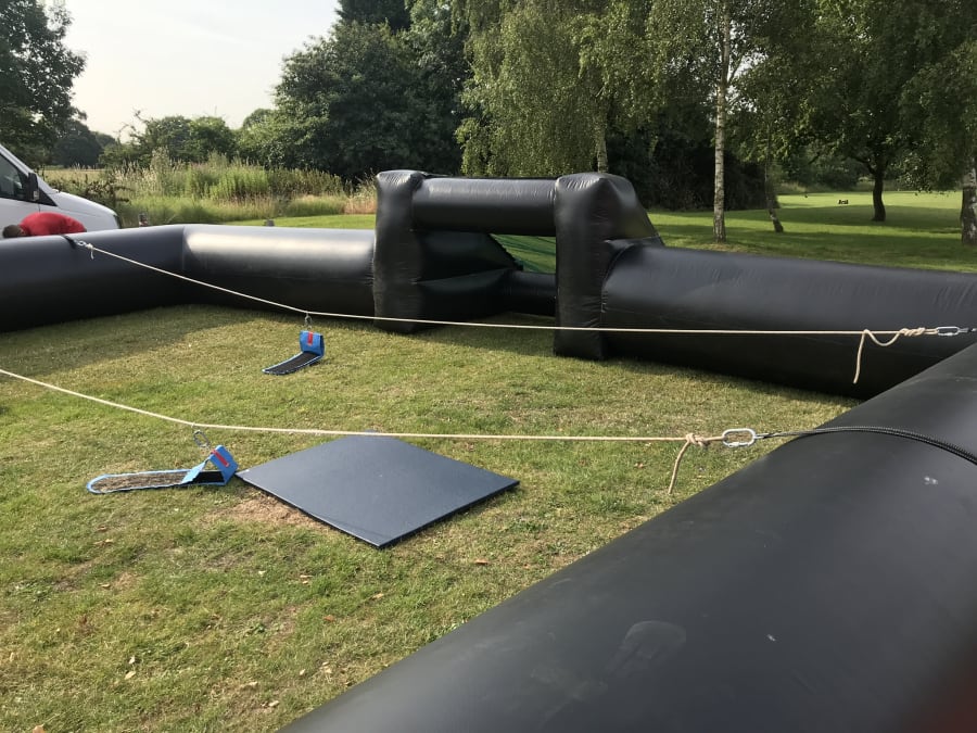 Players are attached together by a line of harnesses. If 1 player moves left all players move left! Very comical football action, great team building and definitely worth hiring for any event.